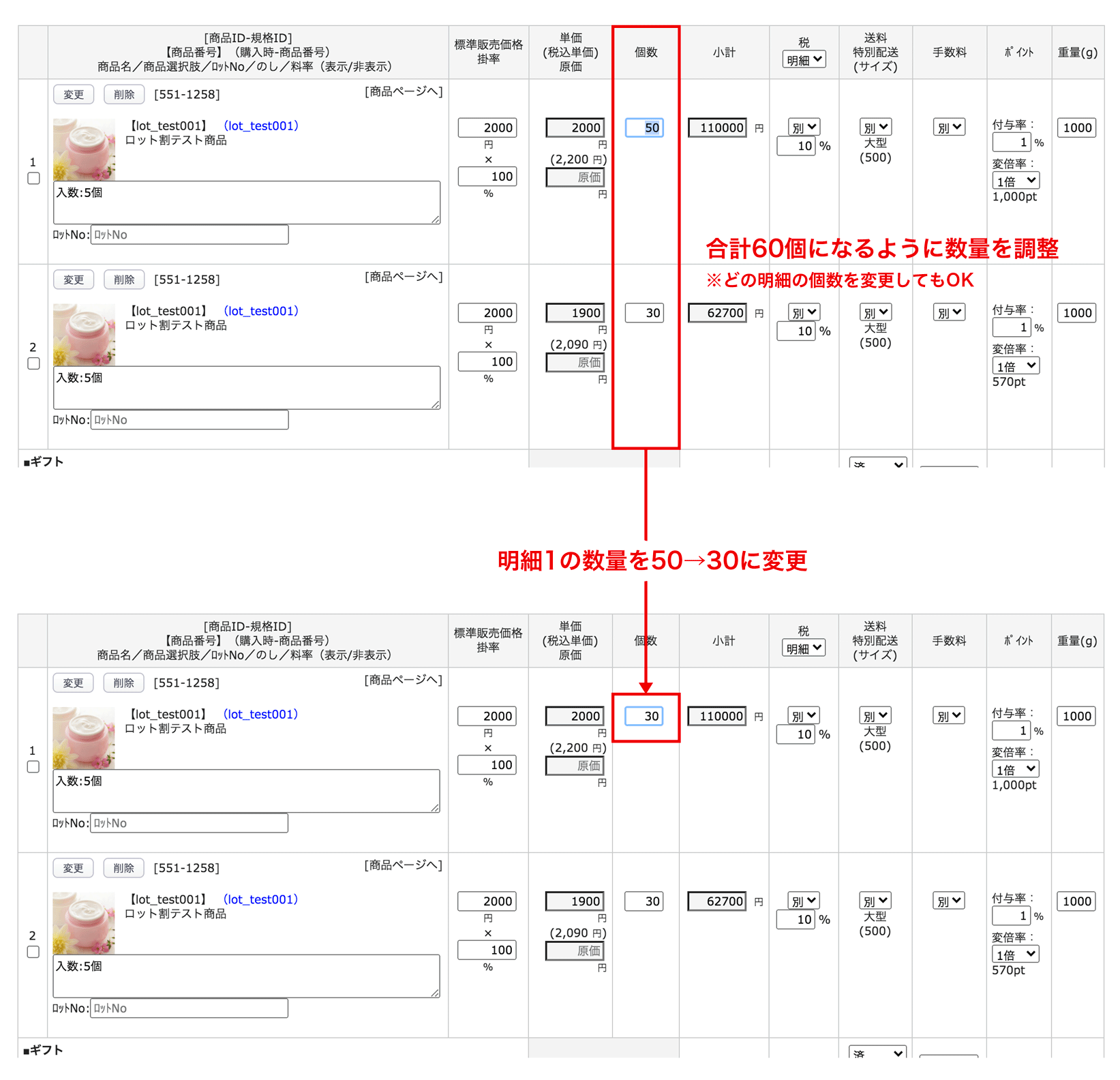 1.明細の個数の合計が60個になるように数量を変更する