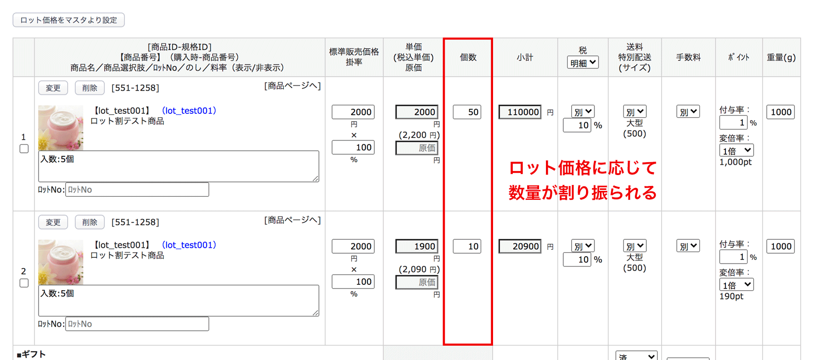 1.購入する商品に、以下2パターンのロット価格を設定