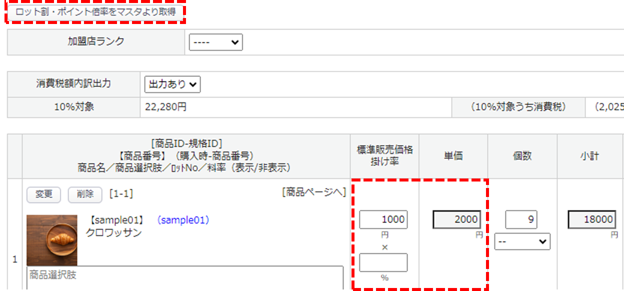 [ロット割・ポイント倍率をマスタより取得] ボタンから再計算が可能です。